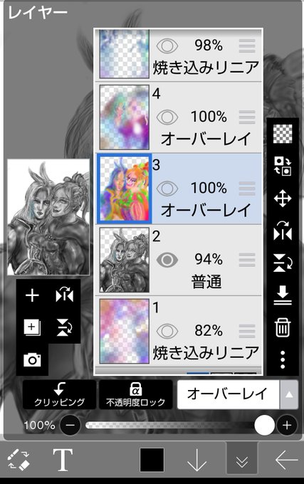 @tb_mai うわわわっ💦グリザイユという技法があるそうで、黒白で下絵を描いて、オーバーレイを使って彩色する感じです‼️私のやり方がグリザイユであるのかよくわかんないですけど(笑)背景はなんとなく焼き込みリニアというのをつかってみたらいい感じだったので入れ、加算発光は最終的にオーバーレイに。