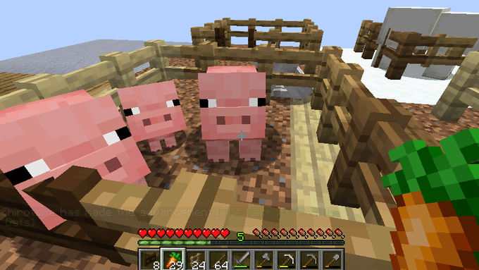 そして細々と拵えていた小麦と人参が育ち、2匹以上いたブタとムーシュルームの繁殖に成功した。