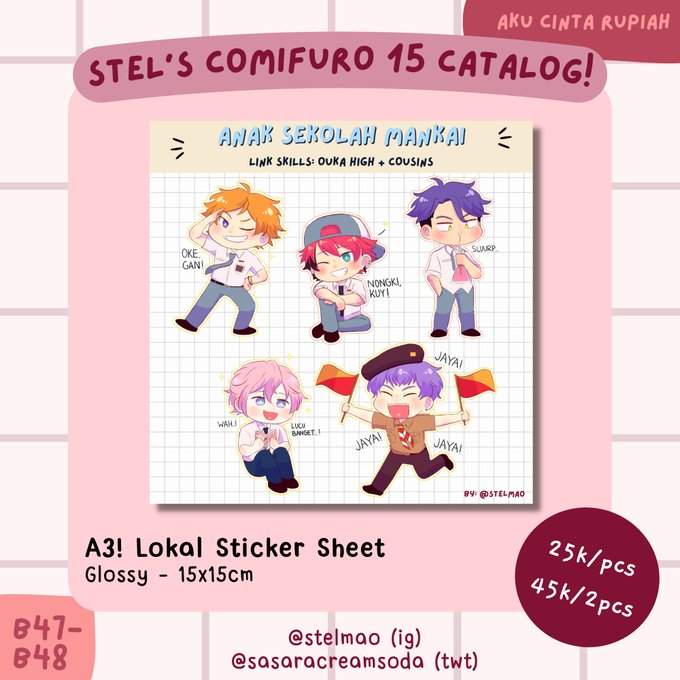 hi everyone maaf ngepost ini malem2 but this is my personal catalog for #comifuro15 !! i will sell a3! lokal au stickers and hypmic keychains on both days :D ayo yg kesulitan mencari konten a3! atau hypmic di cf silakan dibeli /heh
