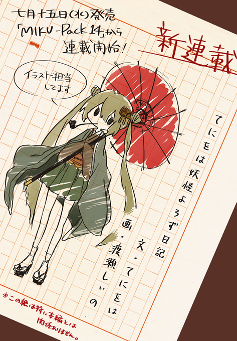 【告知】7月15日発売『MIKU-Pack14』より、ボカロP/作家のてにをはさんによる新連載「てにをは妖怪よろず日記」のイラスト担当させていただくことになりました。よろしくお願いします。http://t.co/OaFZ0dfeK3