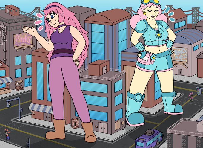 A commission done by @TokoGiantsu that has an inevitable meeting of Pinky and Toko as they stand in the city of Cloverleaf receiving praise for their heroic efforts. #giantess