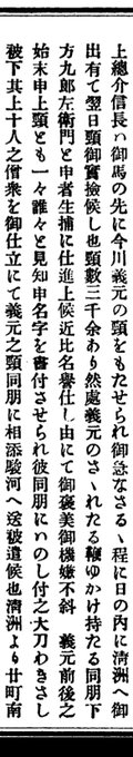 捕虜・下方九郎左衛門が首級の面通しに応じた事を賞賛、太刀脇差しを与え十人の使僧と共に義元首級を駿河へ返還する