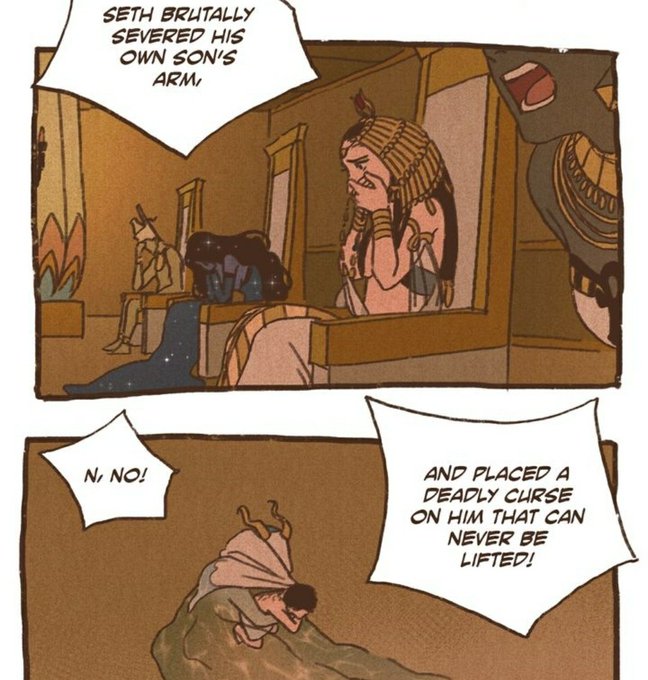 This is one of the scenes that hurt so much in a re-read; Seth is so afraid of being vulnerable, but he collapses and begs Isis to save Anubis' life here... And to know that Anubis' life is now in the hands of his greatest enemy, whose vile deeds we learn of later...(ToT)