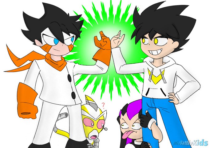 Even though I made his hair black because of his main design inspiration "Chiro" The Super robot monkey team AND I directly styled his hair after a specific picture of helmetless megaman (which is basically just a generic anime boy hair style 🙃)