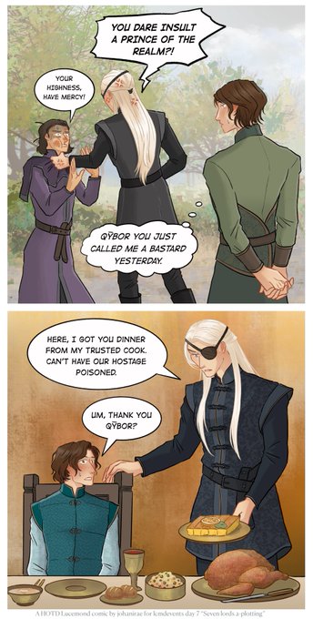 @lcmdevents Day 7: Seven lords a-plotting - To the delight of the Greens, Prince Aemond captured Prince Lucerys whilst in Storm’s End. The lords whispered of all the intrigues they can plot now that they have a hostage... right? #lucemond