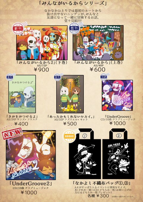 12/30(日) 東Z-33b "ヨジハン! + Wakaru Records" のお品書きです。Undertaleの薄い本と薄いCDが出ますよろしくお願いします!!!