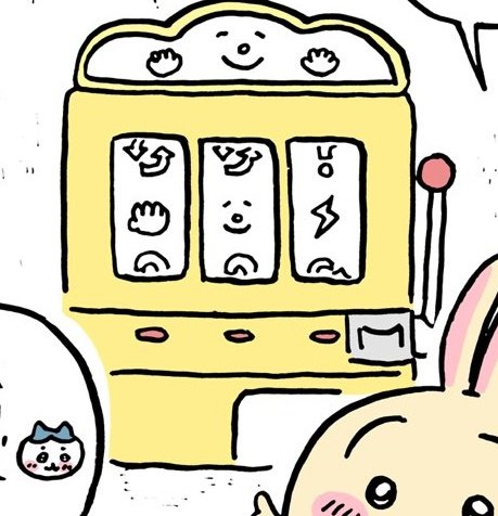 @ngnchiikawa 一コマ目でうさちゃんがスロット回してて、🔄が揃った瞬間うさちゃんの色が薄くなって次のコマでスロットの前にいるのがハチワレちゃんになってるから、中身が入れ替わる(移動する)のではなくて見た目が入れ替わるのね🎰