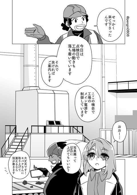 その日の話シリーズ 拙宅マサユウ漫画の16話②です。 ユリちゃんとバナさんと工場見学。工場模造しかないです。雰囲気でお願します。工場と言えばパネルダンジョンだよね、みたいな…