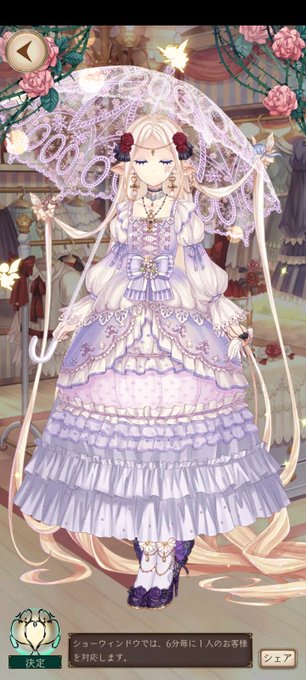 開店しています。提示テーマはおとぎの国のお姫様。白長髪のエルフの姫に淡い紫のドレスを着せました。黒を効かせて、各所の薔薇と足首の蝶がポイント。
