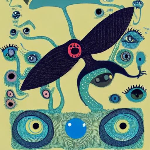 「体中に沢山の目があるクジラ、ファンタジック、いい景色、絵本調」から良さげな結果を取ってちょっと描写を削り、さらに「沢山の目のあるクリーチャー」にする 思ってたのと大分違うがいい感じに何だか分からなくてこれはこれでヨシ