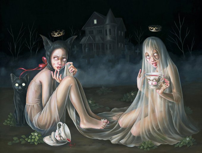 Hanna Jaeun Brooklyn based talented painter BFA in apparel design from Rhode Island School. Acrylic on wood, inspired by religious imagery, puppetry and her own anthropomorphic creatures. Themes of vulnerability, isolation and exclusion, beautifully gloomy, fatally romantic
