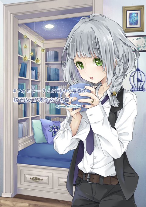 ボーイッシュor男装・アシメ・萌え袖・星ヲタ?・両手でマグカップを包み込んで持つ・銀髪ショート・文学少女・メガネ・おさげ・タレ目