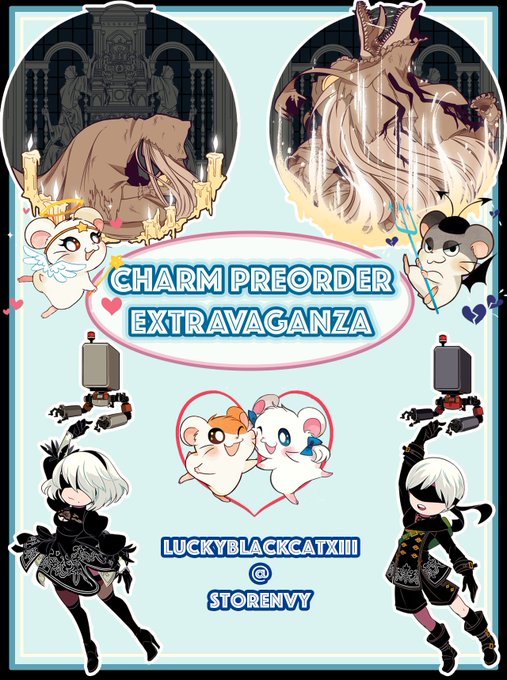 HEY ALL! I'M FINALLY TAKING PREORDERS ON CHARMS! Specifically, my Vicar Amelia, Ham-Ham Heartbreak, Nier: Automata and FFXIV primal charms! These will be open for 3-4 weeks and I plan to ship them out by the end of February-Mid March at the latest.