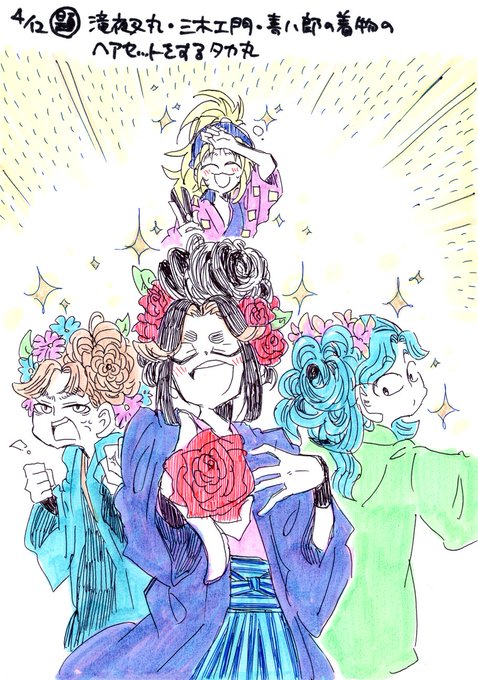 一日一枚、無事スキャンしたので、モーメント用にまとめて投稿します。 4/12 お題箱より:滝夜叉丸・三木ヱ門・喜八郎の着物のヘアセットをするタカ丸 4/13 お題箱より: 日向♀と稲荷崎のみんなめまったりお花見 4/14 お題箱より:山形くんと日向でめっちゃ笑顔なツーショットwith白鳥沢