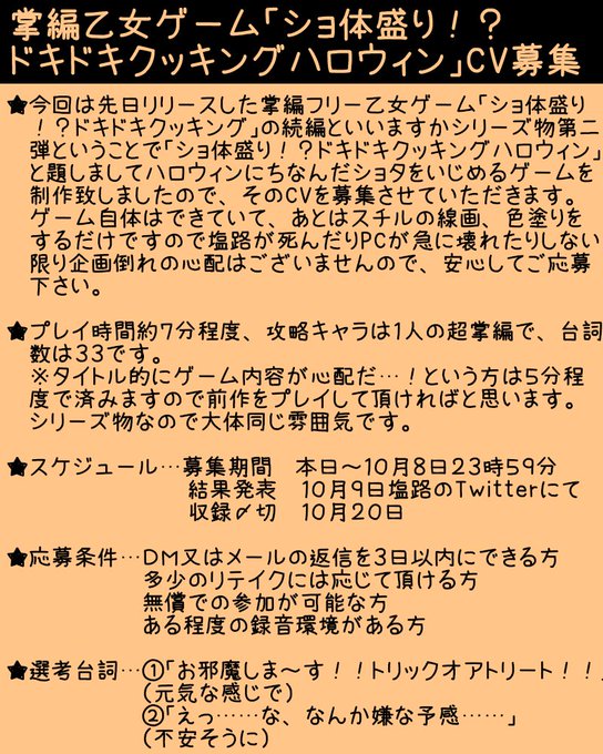 ハロウィンまでに公開予定の掌編乙女ゲームのCV募集をさせて頂きます!詳しくは画像をご覧下さい(※文中の前作とはこちらのことです。シリーズ物とはいえ今回募集するウィン君は完全新キャラなのでプレイは必須ではありません→https://t.co/mXyDs1WU1a)