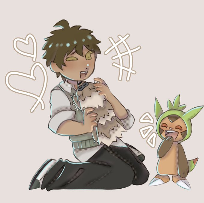 prompt: kmhn pokémon au, Komaeda has an Eldegoss and Leafeon, Hinata has a Chespin and a Zigzagoon, go wild with outfits (I’d like to have Komaeda wearing overalls unless you think of a design that would be super fitting though <3)