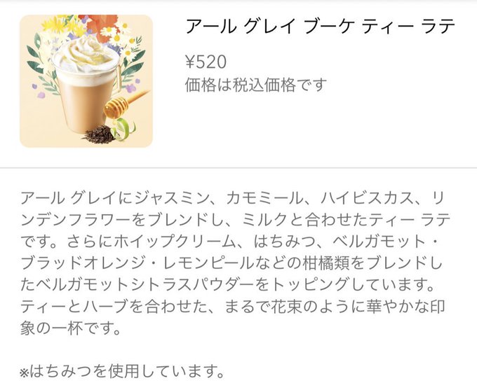 スタバの新作『アールグレイブーケティーラテ』スタバ史上過去イチ華やかな香りと美味しさで衝撃なんだけど…アールグレイにジャスミン,ハイビスカスなど4種類のお花の茶葉が入って更にレモンピールとか柑橘類も3種類ブランドされてて名前の通り花束すぎる…癒されるし香り良すぎるし何これ毎日飲む☕️