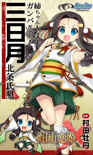 北条“三日月”氏照。朔夜の三女で十六夜の妹。一本気で真っ直ぐな性格で姉妹を何より大切にしている。笛の名手でもある。『戦国†恋姫X』4月28日発売!絶賛ご予約受付中! https://t.co/y2gQIjxrJC #戦国恋姫