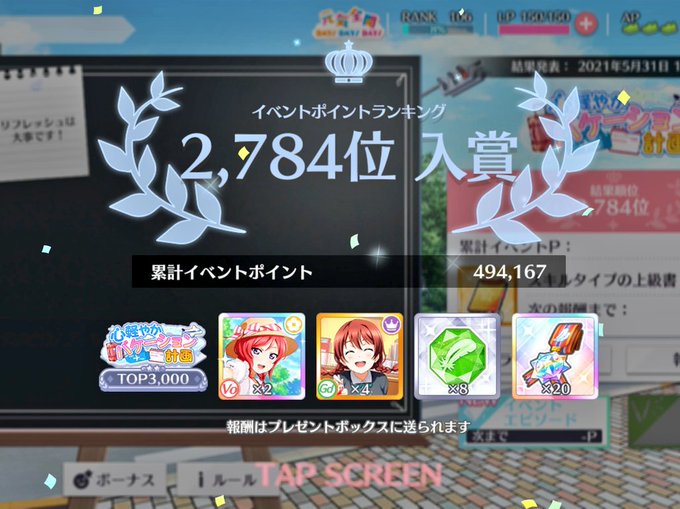 おはようそろ~( ´・ω⊂ヽ゛☀️ もぅ月曜日~で5月も終わりね~早いもんやね あ、今回のイベントお疲れさまでした。お話もおもしろかった😆 結果は… うちなりにかなり頑張ったです💦 UR・SR沢山もらえたのはありがたいね(*´∀`)♪ さて、今日も一日がんばってこー! \(゚∀゚)/