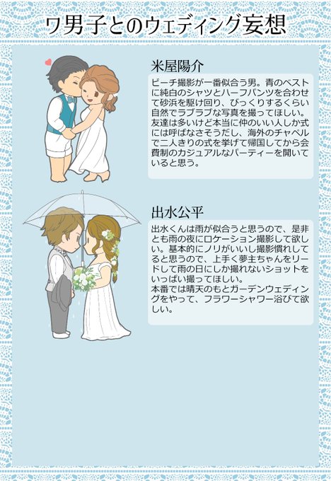 ワ男子とのウェディング妄想① 描きたい子が多すぎて膨大な数になったのでツイート分けてます しのだ/あずま/ふゆしま/にのみや/すわ/くるま #wtプラス