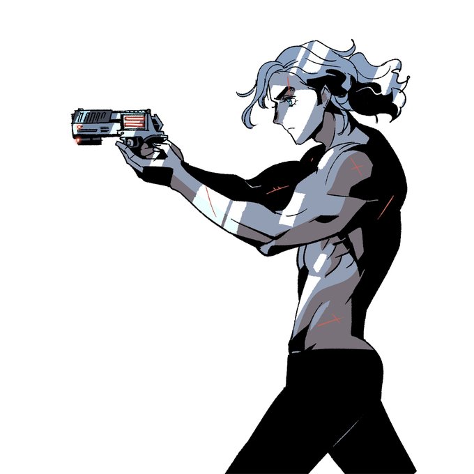 인체연습겸 언젠가는 이렇게 작화해보고싶다 그림테스트중. 빛과 그림자를 강조한 살짝 그래픽노블 풍으로. 대충 손가는대로 끄적거린 총이 예쁘게 그려졌길래 흡족하여 확대강조해줌. SF풍 중절식 빤딱빤딱 리볼버👍