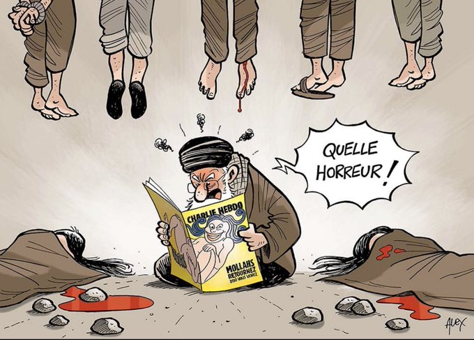 @alexballaman insertó en su ironía @laliberte🇨🇭 sobre la brutal represión en #Iran la #portada del especial 7º aniversario de la matanza de #CharlieHebdo