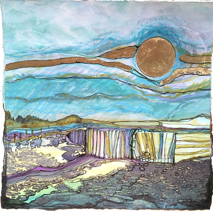 The sun is shining & I have just finished a new work a sketch with collage fine line and gold leaf
