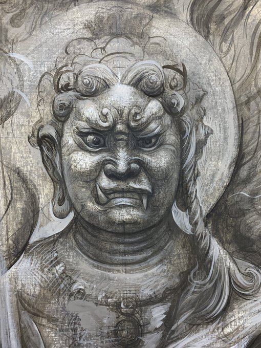 田舎から帰る。風呂上がり寝る前の一筆。大下図は不動様以外は参考に留め、脇侍の童子達の位置を変えたり焔の形もどんどん変えている。小品制作注力月間だが外泊以外は必ず筆を加える規則だ。どうやっても2日は留守だ。東京出発の朝と帰宅後はいじれる。 #不動明王