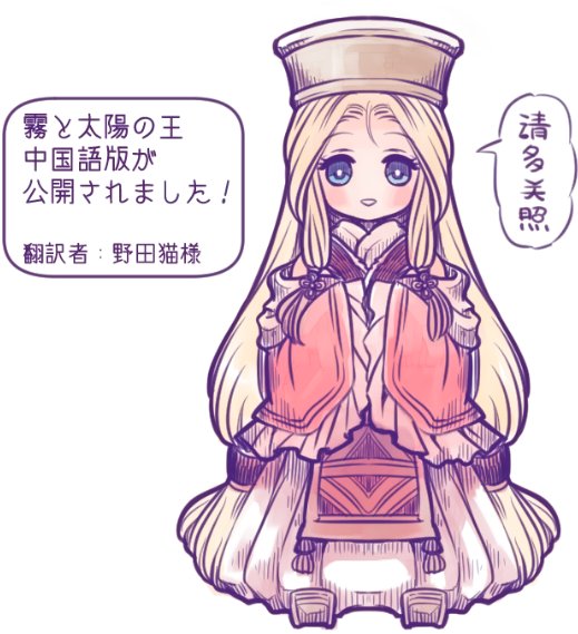 霧と太陽の王の中国語版が公開されました!かなり前にお話を頂いていたのですが、こちらの都合でアップデート後まで待って翻訳して頂きました。翻訳者は野田猫様です。ありがとうございました!