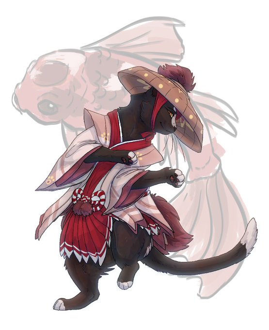 Was challenged to draw based on a chosen ninja cat photo with a couple of my friends. I drew a cat wearing mizutsune armour from MonsterHunter.
