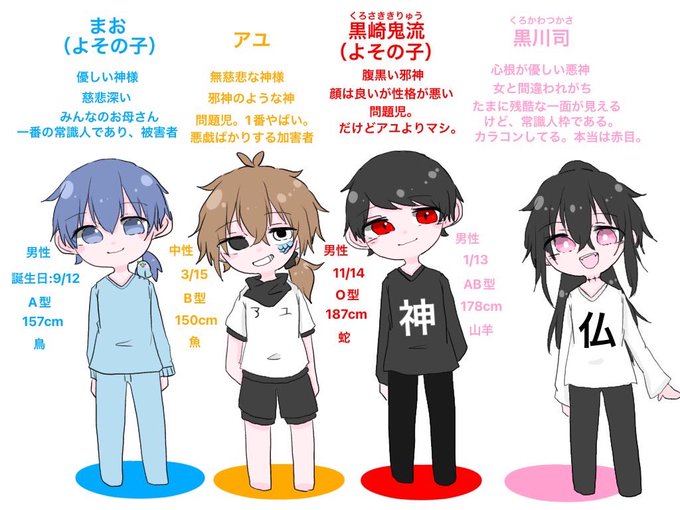 3月では「主人公組」について紹介したので4月は敵対勢力の方々を紹介します!ふざけた名前してますが彼らは神様です((