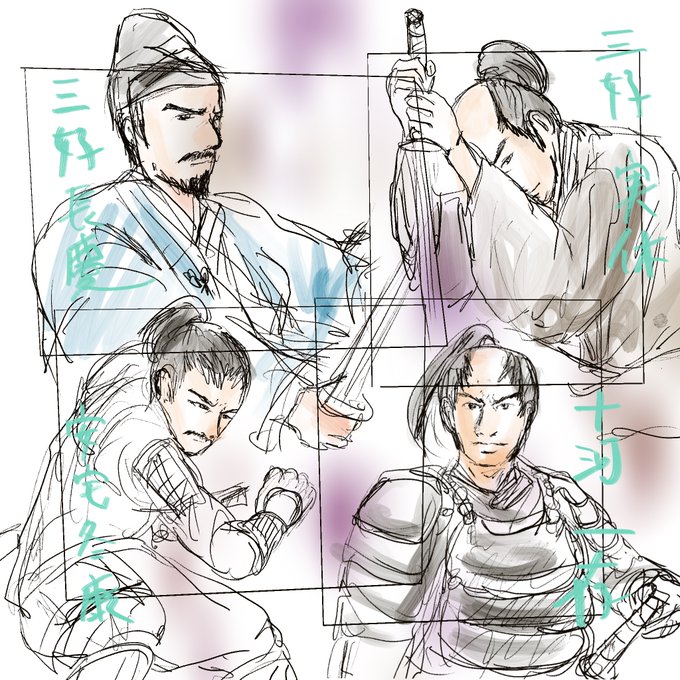 なんだかんだで、三好家兄弟がみんな見たいという感じになったので、描いてみたけど、鬼十河の頭をどうしようか迷う。そして、推しの実休はむちゃくちゃかっこよくしたいけど、私の絵では無理なラフね!
