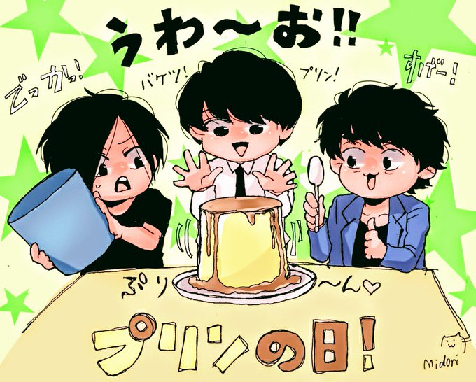 プリンを食べると思わずニッコリ!ということで毎月25日はプリンの日らしいのでプリンを食べるおふたり🍮💓星空くんのは特製バケツプリン。(笑) #あすかなアート #苺谷星空の毎日記念日
