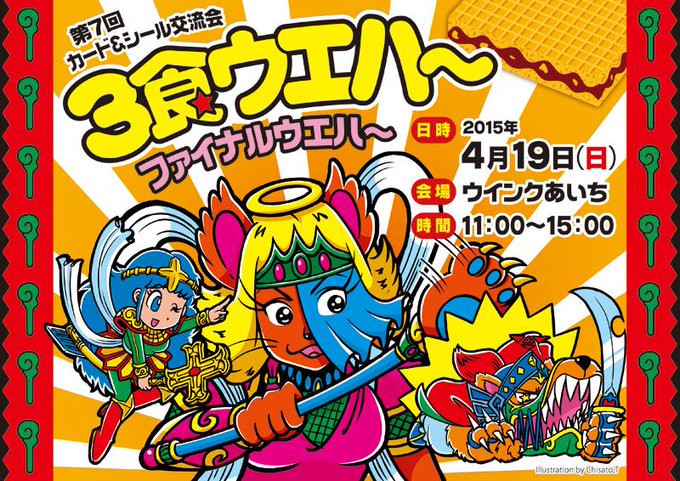 シール&カード交流会「3食ウエハー」2年ぶりにチラシイラスト描かせていただきました!4月19日名古屋(ウインクあいち)にて。ビックリマン・神羅万象等平面食玩クラスタの方ぜひご来場を! http://t.co/2r5mCb38fq