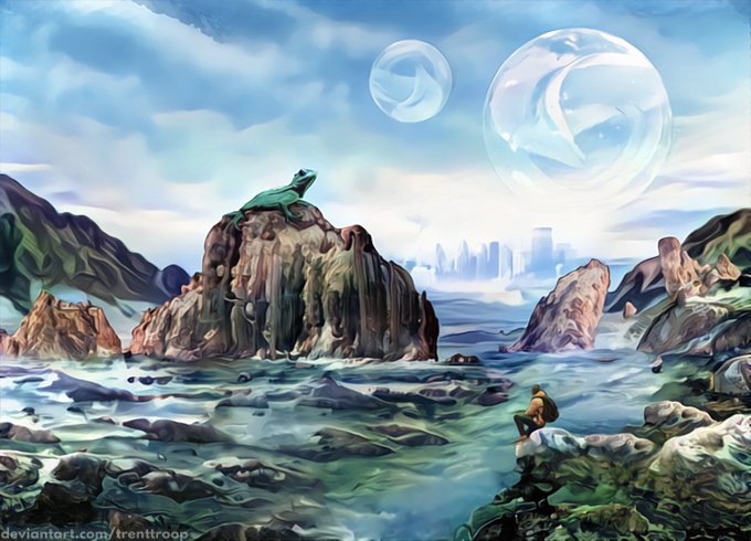"80s Haze", "Bones of the World", "The Delving Place", and "Gap Light-Year". #artbreeder/digital painting combinations. #ArtistOnTwitter
