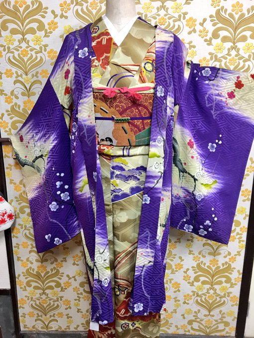 #今日のトルソーさん に梅に鶯の長羽織を合わせました。華やかでとても素敵な羽裏です(^^) 着丈98.袖丈66.裄67㎝ とこちらもレアな大きめサイズです。 #アンティーク着物 #着物コーディネート #長羽織 #キモノ葉月