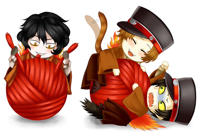 WHさん @WHGameFactory の毛糸に捕まる鬼間暮さんに心臓を鷲掴みにされたので、他の火車(左右と刺名さん)にも与えてみました…まん丸なものにじゃれつくにゃんこ可愛いです