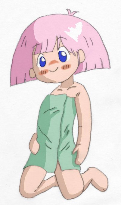 #いい風呂の日 タグをつけるのも恐縮ですが(^^;) 先日の膝立ち絵をもう一度。髪の描き方ツイートと、あるかたの描いたバスタオルイラストに感銘を受けたので、反映してみました(*^^*)