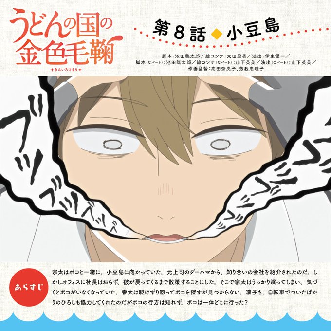 【放送情報:うどんの国の金色毛鞠】日本テレビでは本日27:55より第8話「小豆島」放送です!ひろしも登場しますよ♪通常より繰り下げての放送となります。遅い時間の放送ですが、どうぞ宜しくお願いいたします。 #うどんの国 (ほそい)