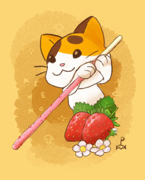 今日頑張った人も、これからもうひと頑張りする人も、つぶつぶイチゴポッキーをどうぞ。 #キネコ #ネコ #キノコ #イチゴ