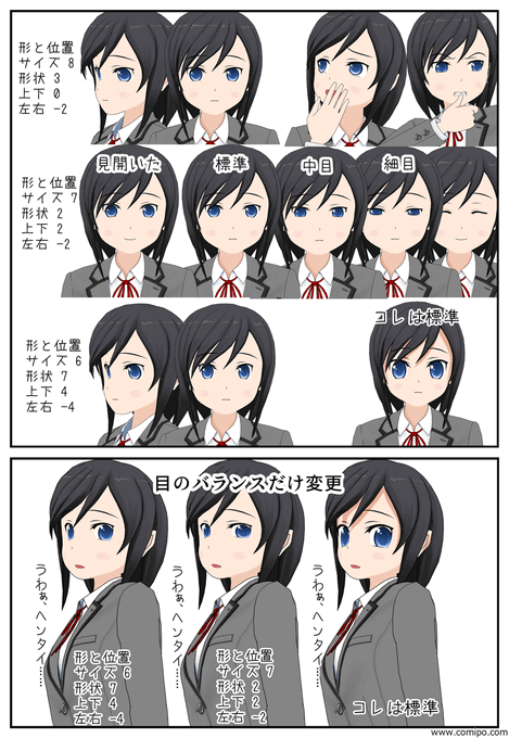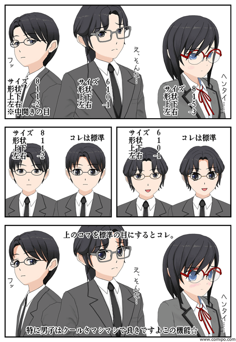 コミPo! β版の、目の周りをいじれるシステム。女の子はしっとりお姉さん、男の子は目元すずやかイケメンが作れて素晴らしい #comipo