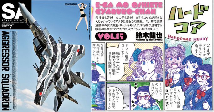 スケールアヴィエーション7月号が発売中です。1ページ映画紹介まんが『映画もおしえて!ギャル子ちゃん』、今回は完全FPS視点のみで作られたアクション映画『ハードコア』を紹介してます。まだギリギリ上映中のとこもあるみたいなので、ぜひ劇場で。あとギャル子の1/20フィギュア情報も。