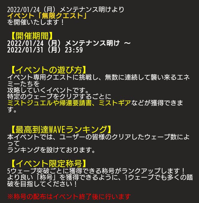 そして古参勢お待ちかねの無限クエストが久々に来る模様。