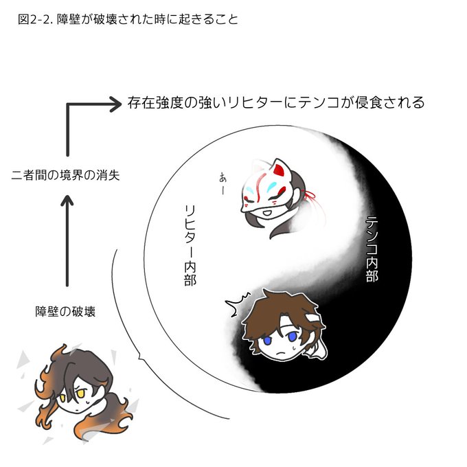 テンコは生来自己が薄く、他者の人格や感情に引きずられやすい生物です。分厚い防壁で心理的な距離を保っているからこそ彼女は彼女のままでいられるので、それが壊れてしまうと直に接続しているリヒさんにまず塗り潰されていきます。消滅はテンコの自己イメージの保持で防げます。