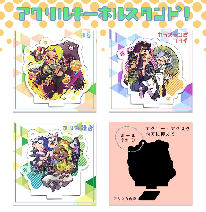 スプラケット19新作のヒロモアクキー+スタンドになります。3号、カラストンビ部隊、すりみ連合の3種です!アクスタ台座とボールチェーンお付けするのでアクキー、アクスタ両方楽しめます。イラストはへちょ丸さん!着色は夜月が塗らせて貰いました。boothで通販開始してます。 https://t.co/UwLRLo6uKc