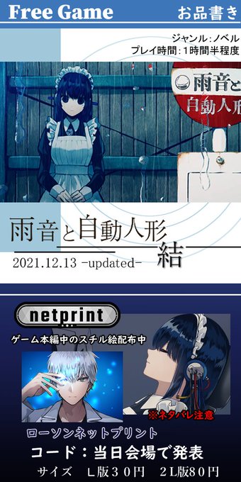 記念にあとがきペーパー(A4)と2L版(フチあり)2枚をネットプリント配布させて頂きます(2L版はL版でも大丈夫ですが出来ればフチありで印刷してください、見切れるので…)