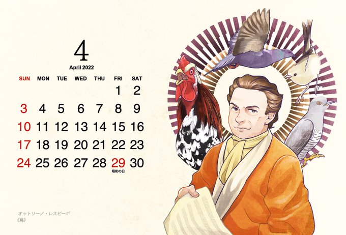 4月のクラシックカレンダーはレスピーギの《鳥》。17世紀の楽曲を集めて作曲した管弦楽組曲で、第1曲「前奏曲」につづいて第2曲「ハト」第3曲〈めんどり〉第4曲〈サヨナキドリ〉第5曲〈カッコウ〉はパスキーニのピアノ曲『かっこうの鳴き声をもつトッカータ』で構成。