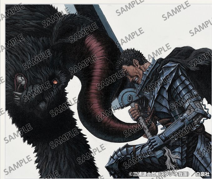 画像の「連載20周年記念ポスター」用描き下ろし作品をはじめ、圧倒的画力で描かれたゾッド(&ガッツ)。イベントでの原画展示も予定しております。 #ベルセルク #三浦建太郎 #大ベルセルク展