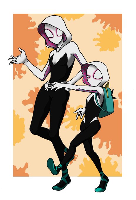 お題箱より『スパイダーグウェンとお揃いのスーツを着用したペニーパーカーちゃんを描いて(2人ともマスクもしてるけど、リュックしているのがペニーということで)。』
