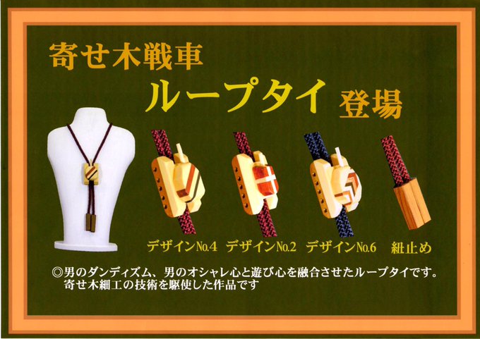 多満留屋です。聖地巡礼のお土産に迷っている方は、明日大洗マリンタワー前広場の多満留屋ブースお越しください。何これ商品を取り揃えてお待ちしております。その一部を紹介します。寄せ木戦車ループタイ、寄せ木戦車モデルミニスリット仕様です。